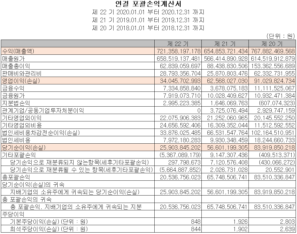당사의 2020년 실적은 매출액 7,214억 원으로 전년 대비 10.2% 증가했고, 영업이익은 340억 원을 기록하면서 45.6% 감소, 당기순이익은 259억 원으로 54.2% 감소했습니다. RF PCB의 매출이 감소하였으나, 다층 기판의 매출이 크게 증가하면서 코로나19의 상황 하에서도 매출 성장이 있었습니다. 스마트폰 중저가 모델의 물량 증가로 인해 수익성이 감소되었고, 코로나19로 해외 법인의 생산 효율성 저하로 인한 비용 증가가 있었습니다.