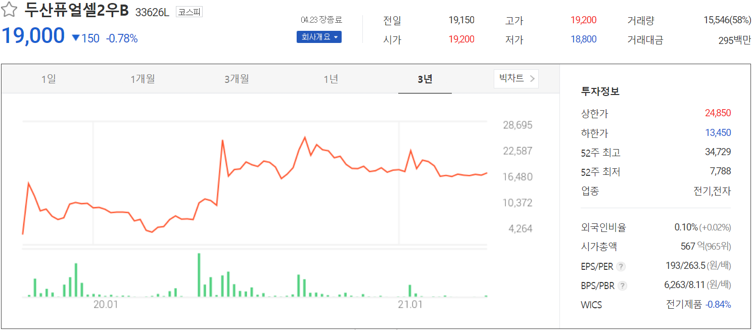 두산퓨얼셀2우B는 4월 23일 19,000원에 거래를 마쳤습니다. 외국인 비중은 0.10%이며, 시가총액은 567억 원으로 코스피 965위입니다.