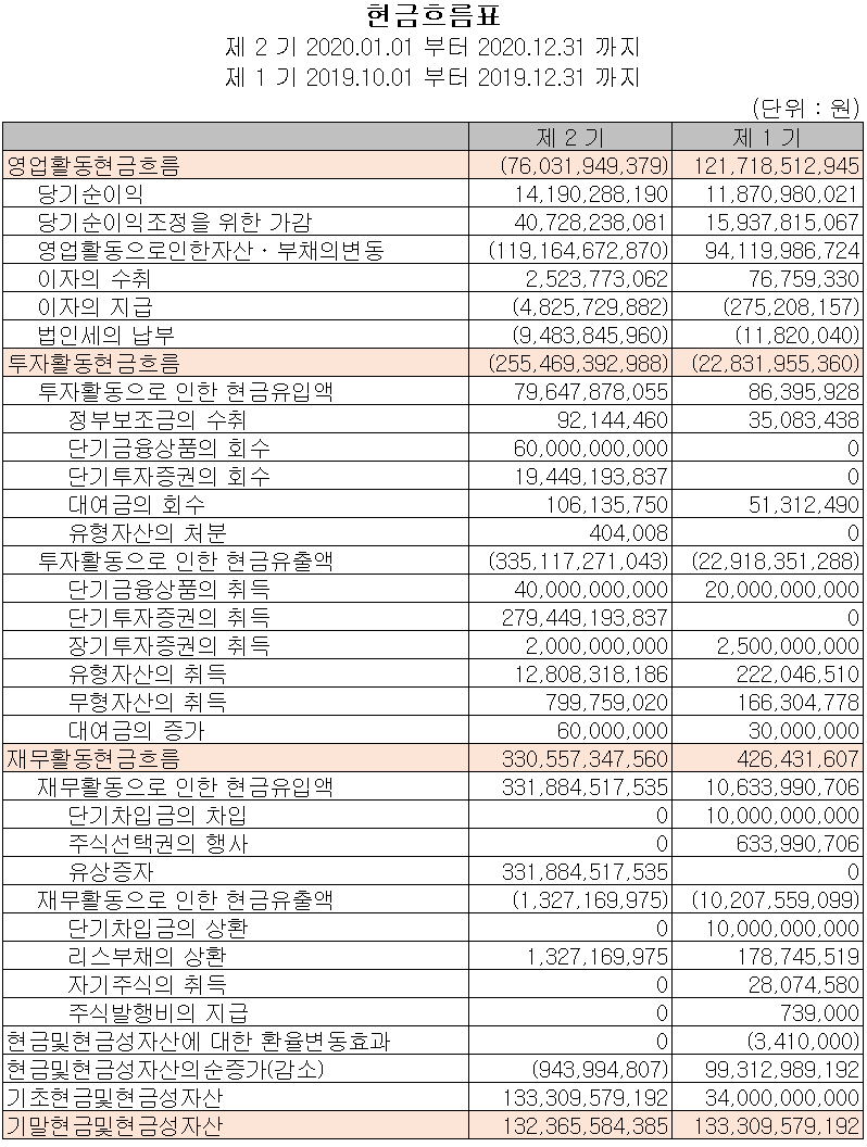 영업활동 현금흐름에서는 당기순이익이 142억 원 발생하였으나 선수금의 감소 등 영업활동으로 인한 자산 및 부채의 변동으로760억 원이 유출되었습니다. 재무활동에서는 당기 중 실시한 주주배정 유상증자 납입 등으로 인해 3,306억 원이 유입되었고, 리스 부채의 상환이 있었습니다. 투자활동에서는 유상증자 대금을 이용한 자산운용 등으로 전체 2,555억 원이 유출되었고, 기타 설비 투자 및 연구 개발비가 유출되었습니다.