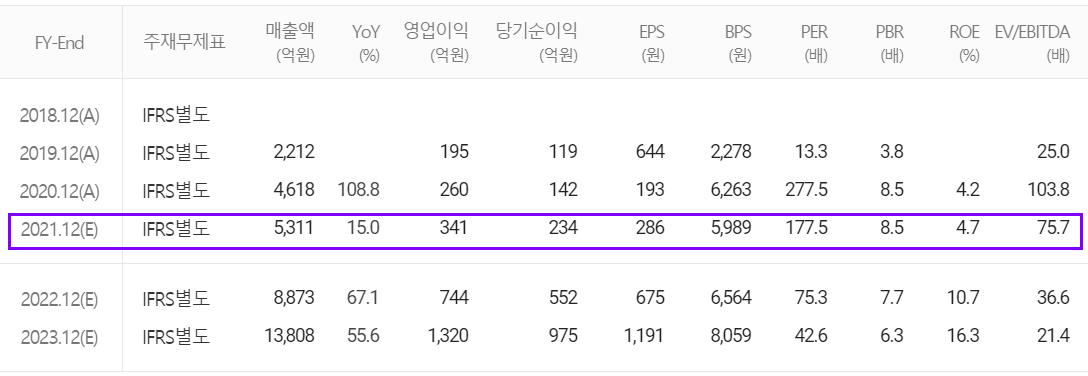 당사의 2021년 예상 실적은 매출액 5,311억 원으로 전년 대비 15% 증가하고, 영업이익은 341억 원으로 31.2% 증가, 당기순이익은 234억 원으로 64.8% 증가할 것으로 추정했습니다.