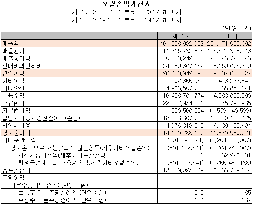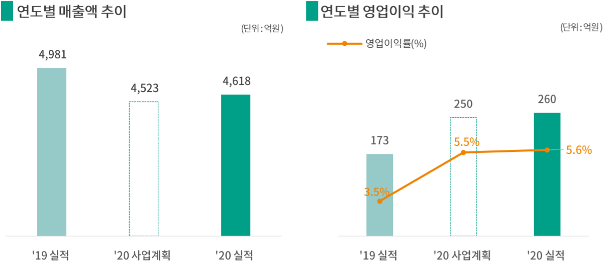 당사의 2020년 실적은 매출액 4,618억 원, 영업이익 260억 원 그리고 당기순이익은 142억 원을 기록했습니다. 제1기는 3개월 실적만 해당되므로 아래 당사의 IR 자료를 참고하여 전기와 비교하는 게 좋을 것 같습니다.