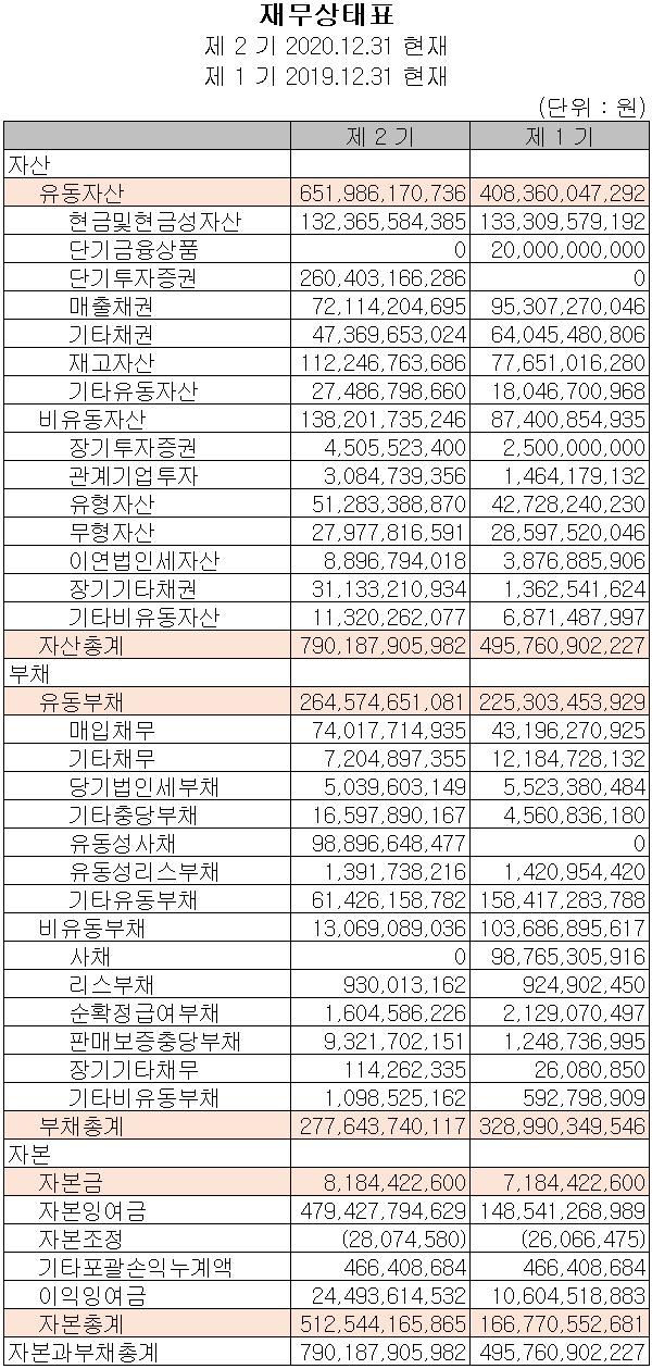 2020년 당기 말 기준 당사의 자산은 전년 대비 2,944억 원 증가한 7,902억 원으로 장단기 금융 투자 및 유형 자산 등의 증가가 있었습니다. 부채는 513억 원 감소한 2,776억 원으로 매입채무 및 유동성 사채 등이 증가하였으나, 기타 비유동부채 및 유동부채의 감소가 있었습니다.