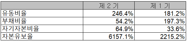 2020년 당기 말 재무 안정성 비율면에서는 유동비율 246.4%, 부채비율 54.2%, 자기자본비율 64.9%, 자본유보율 6,157.1%를 기록하면서 전반적으로 건실하고 안정적인 재무상태를 유지하고 있습니다.