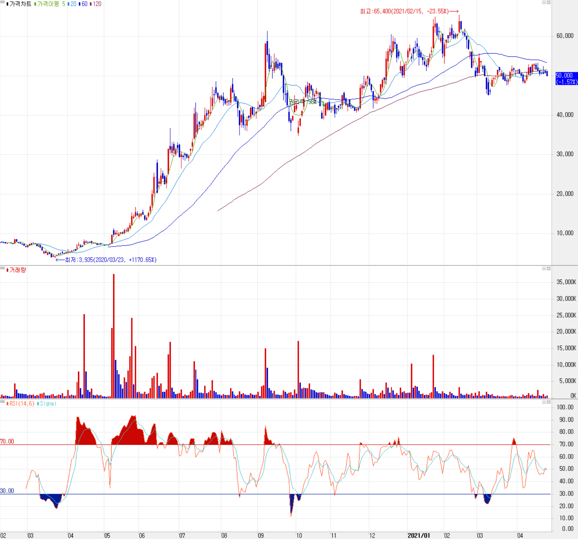 지난해 코로나19로 인한 급락 후 빠르게 회복한 당사의 주가는 수소경제의 가장 큰 수혜주로 꼽히면서 당사의 공격적인 투자와 함께 장기간 급등하다가 지난해 10월에서 12월 사이 조정을 받은 후 지난 2월 15일 장중 최고가인 65,400원을 기록하였습니다. 이후 시장의 수급 변동성 및 금리 우려 등에 따른 조정을 받은 후 최근 완만한 상승 흐름을 보이고 있습니다. 최근 한 달간 수급에서는 개인이 7 거래일 연속 순매수하는 가운데 기관과 외국인은 매도 우위를 보이고 있습니다. 밸류에이션 부담이 있어서 차트 관점의 소견만으로 볼 때 개인적인 목표주가는 68,000원으로 설정하였고, 56,000원 부근에서 저항이 예상되며 조정 시에는 48,000원 근처에서 1차 지지로 보고 있습니다. 밸류에시션 부담이 있으나, 향후 범정부 정책 등을 기반으로 확장성이 큰 기업으로 4월 27일 예정된 1분기 잠정 실적 발표 후 목표 주가는 재점검을 할 예정입니다.