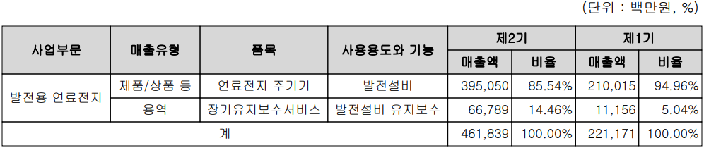 당사는 지난 2019년 10월 1일 발전용 연료전지 시장의 전문성 강화와 성장 산업의 적극적인 투자유치를 위하여 (주)두산으로부터 연료전지 사업부문을 인적 분할하여 설립되었습니다. 따라서 발전용 연료전지 단일 사업부문으로 구성되어 있으며, 발전용 연료전지의 주기기의 제조 및 판매, 유지보수를 영위하고 있습니다. 지난해 발전용 연료전지 설비의 매출은 전체 매출의 94.96%를 차지하였으며, 설비의 유지보수 부문이 5.04%의 비중을 나타냈습니다.