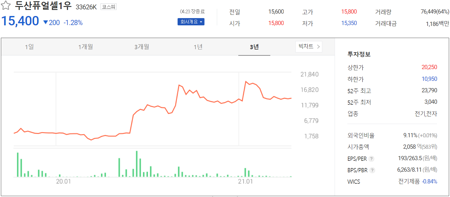 두산퓨얼셀1우는 4월 23일 장 종료 기준 15,400원에 마감하였으며, 외국인 비중은 9.11%을 기록하였습니다. 시가 총액은 2,058억 원으로 코스피 시총 583위입니다.