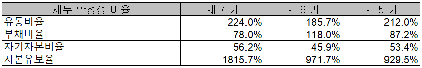 당사의 주요 재무 안정성 비율에서는 유동비율 224%, 부채비율 78%, 자기자본비율 56.2%, 자본유보율 1,815.7%를 기록하면서 안정적인 재무상태를 유지하고 있습니다.