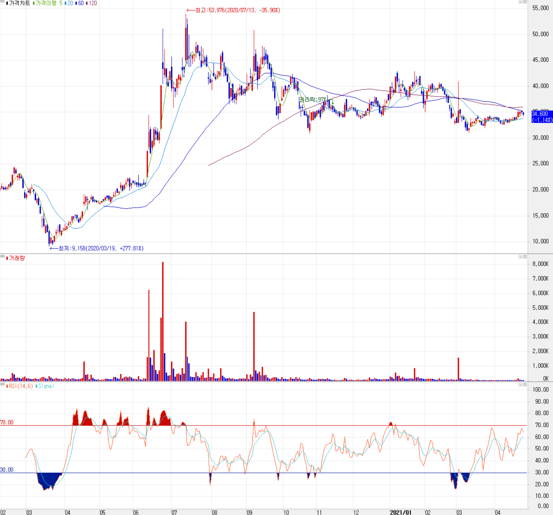 코로나19로 인해 급락한 지난해 3월 이후 회복하다가 6월 들어서면서 코로나19 극복을 위한 범정부 차원의 한국판 그린뉴딜의 발표와 함께 수소 관련 종목으로 관심을 받으면서 가파르게 상승하기 시작했고 10월부터 급등에 따른 조정을 받으면서 횡보하다가 2020년을 마무리했습니다. 2021년 들어서 소폭 상승하면서 한 때 40,000원을 회복하기도 했으나 시장 수급 변동성과 함께 3월부터 최근까지 완만한 추세를 보이면서 35,000원 근처를 유지하고 있습니다. 최근 수급에서는 외국인의 매수 우위 속에 전반적인 거래량이 둔화된 상황입니다. 차트 소견으로 볼 때 개인적인 목표주가는 41,000원으로 설정하였고, 36,000원 부근에서 저항이 예상됩니다.