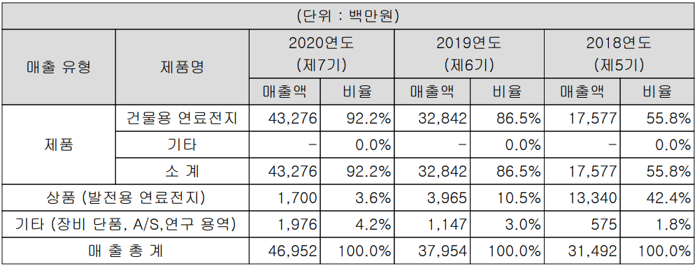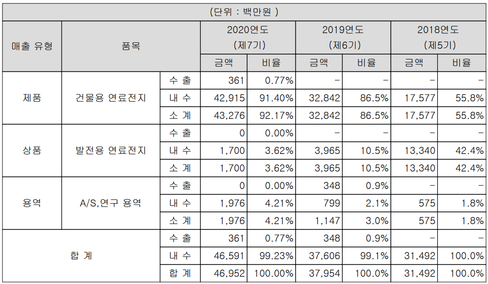 당사는 연료전지 단일 사업 부문으로 건물용 연료전지, 발전용 연료전지 및 유지보수 등으로 구성되어 있습니다. 지난해 당사의 주력 제품인 건물용 연료전지의 매출 비중은 92.2%를 차지하였으며, 발전용 연료전지는 3.6%의 매출 비중을 나타냈습니다.