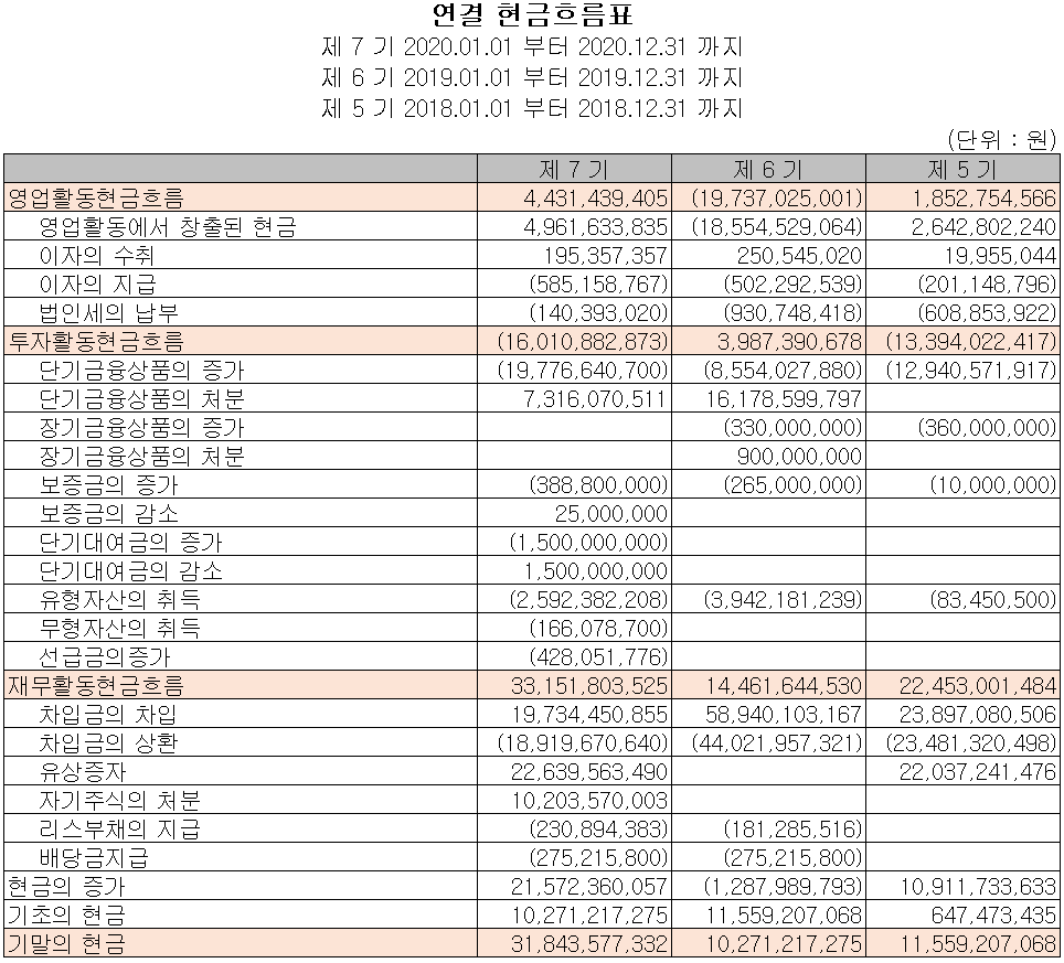 다사는 영업활동으로 현금을 창출하고 있으며, 이자의 수취 등을 포함하여 44억 원의 현금이 유입되었습니다. 투자활동 현금흐름에서는 단기금융상품의 증가로 인해 감소하였고, 차입금 및 유상증자를 통해 자금을 조달하여 배당금을 지급하고 부채를 상환하고 있습니다. 2020년 당기 말 기준 당사의 현금자산은 318억 원입니다.