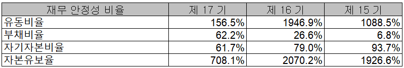 당사의 주요 재무 안정성 비율에서는 유동비율 156.5%, 부채비율 62.2%, 자기자본비율 61.7%, 자본유보율 708.1%를 기록하면서 신규사업에 대한 투자로 부채가 상승했으나 부담되는 규모는 아니라고 판단되며, 이미 매출처가 확보된 사업에 대한 투자 또는 수요 증가에 따른 투자로 판단되어 전반적으로는 안정적인 재무상태로 생각합니다.