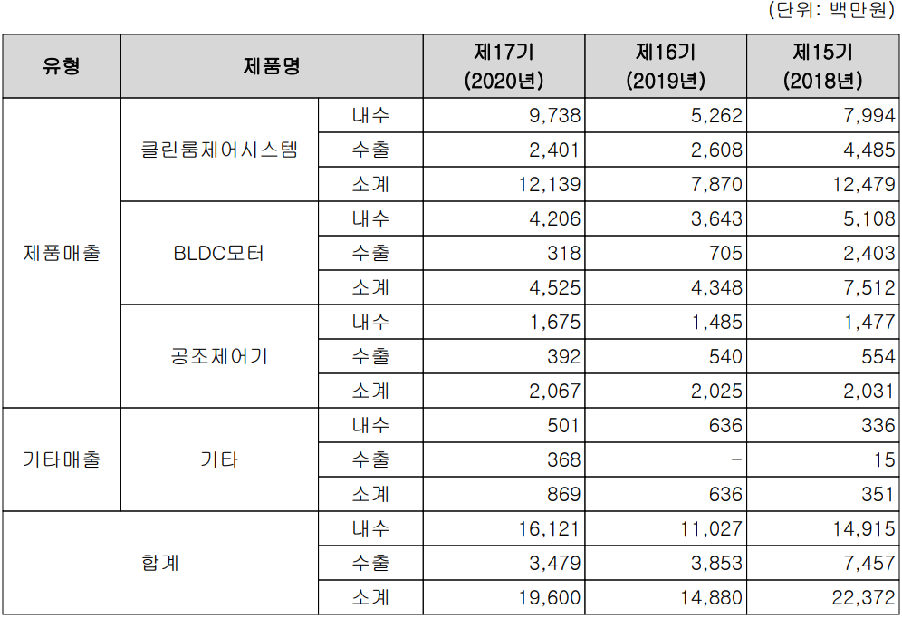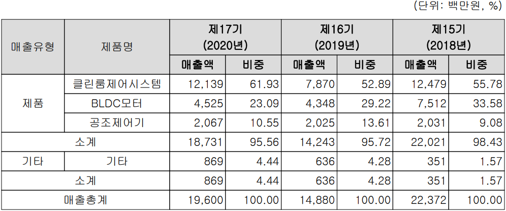 당사의 주요 사업부문은 반도체 및 디스플레이 제조 공정에 필수적인 클린룸 제어시스템 관련 제품과 신규 사업으로 진출한 의료용 진단키트 사업부문으로 구성됩니다. 지난해 클린룸 제어시스템의 매출은 전체 매출의 61.93%를 차지하였으며, BLDC 모터 23.09%, 공조 제어기 10.55%의 매출 비중을 보였습니다.