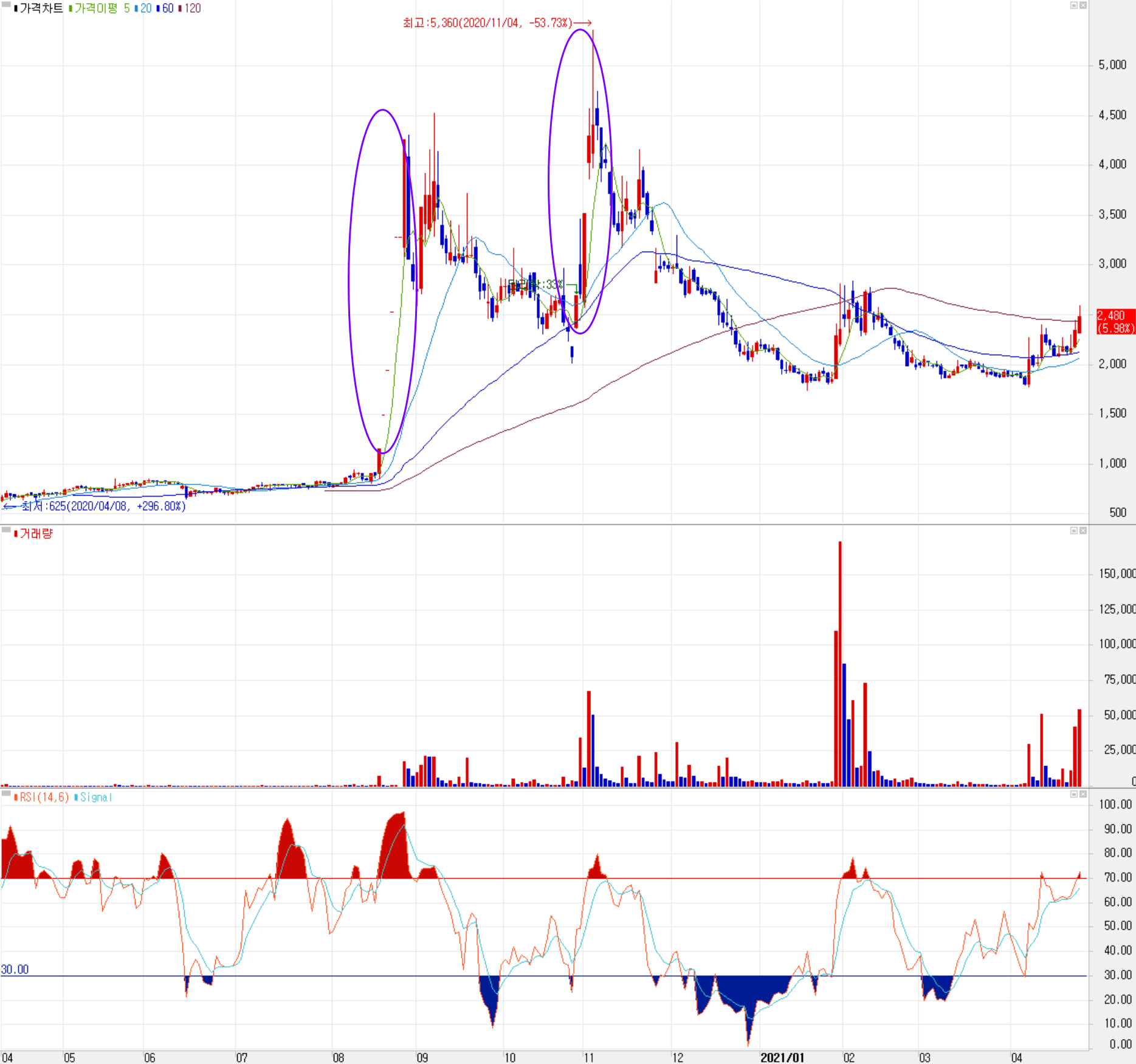 당사의 주가는 지난해 코로나19로 인한 급락 이후 빠르게 회복하였으나 8월 중순까지는 완만한 상승세를 이어가다 의료기기의 제조 및 판매를 하는 (주)비비비의 인수 소식에 연일 상한가를 기록하면서 약 1주일간 4배 가까이 급등했습니다. 또한 11월 들어서면서 당사의 최대주주가 된 비비비가 셀트리온과 공동 개발한 샘피뉴트 코로나19 신속진단 키트의 수출 계약 (2100억 원 규모) 소식에 따라 최고가인 5,360원까지 올랐습니다. 하지만 이후 셀트리온이 다른 제품을 수출하기로 하면서 상승폭을 모두 반납했고, 이전 상승 분의 절반 이상 조정을 받으면서 2,000원 근처를 횡보하다가 최근 반등세를 보이고 있습니다. 최근 한 달간 수급에서는 기관의 수급은 둔화된 가운데, 개인과 외국인이 공방을 벌이고 있습니다. 차트 관점의 개인적인 목표주가는 단기적으로 2,900원이며, 추가 상승 시 2,600원에서 저항이 예상됩니다.