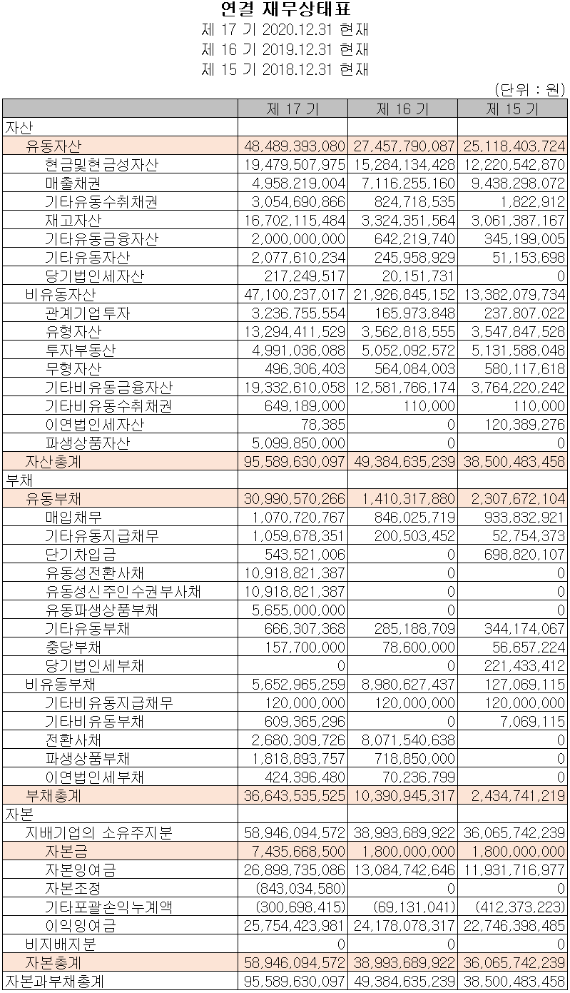 부채는 전년 대비 263억 원 늘어난 366억 원으로 종속회사의 신규차입 진행에 따른 차입금 증가, 사채 발행에 따른 사채와 파생상품 부채가 증가하였습니다.