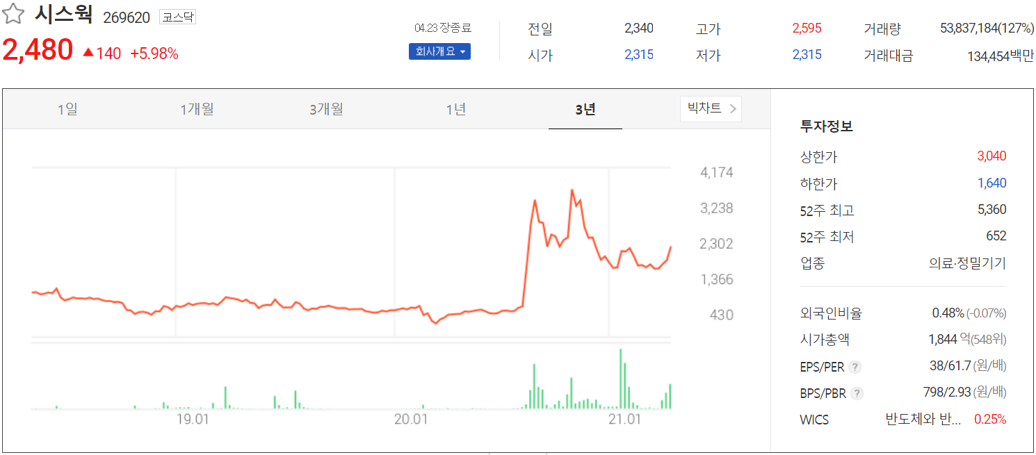 4월 23일 장종료 기준 당사의 주가는 전 거래일 대비 5.98% 오른 2,480원에 거래를 마쳤습니다. 외국인 비중은 0.48%이며, 시가 총액 1,844억 원으로 코스닥 시총 상위 548위 종목입니다.