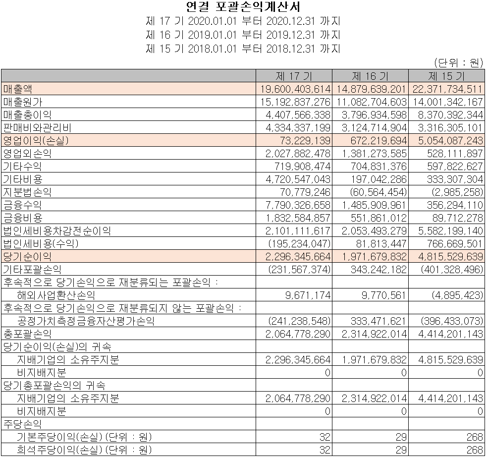 당사의 2020년 실적은 매출액 196억 원으로 전년 대비 31.7% 증가했고, 영업이익은 7322만 원으로 89.1% 감소, 당기순이익은 22억 원을 기록하면서 16.5% 증가하였습니다. 코로나19 상황에서도 주력제품인 클린룸 제어시스템의 수요 증가에 따라 매출이 증가했고, 신규사업에 대한 투자와 원자재 가격 상승으로 인해 이익이 감소하였습니다. 당기순이익의 증가는 사채 발행 등에 따른 금융비용 증가 및 복합금융상품의 기말 공정 가치 평가이익이 반영되었습니다.