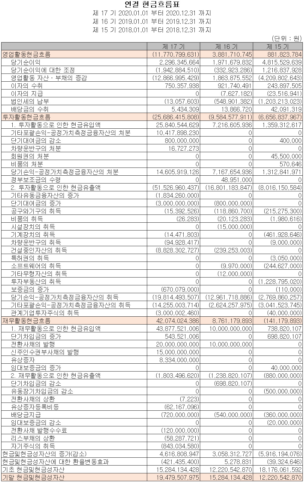 이익의 감소로 인한 영업활동 현금흐름이 감소하였고, 신규 사업에 대한 설비 투자 등으로 256억 원의 현금이 유출되었습니다. 차입금 및 사채의 발행과 유상증자를 통해 자금을 조달하고 있으며, 부채의 상환 및 자기 주식을 취득하였습니다. 2020년 당기 말 기준 당사의 현금 및 현금성 자산은 195억 원입니다.
