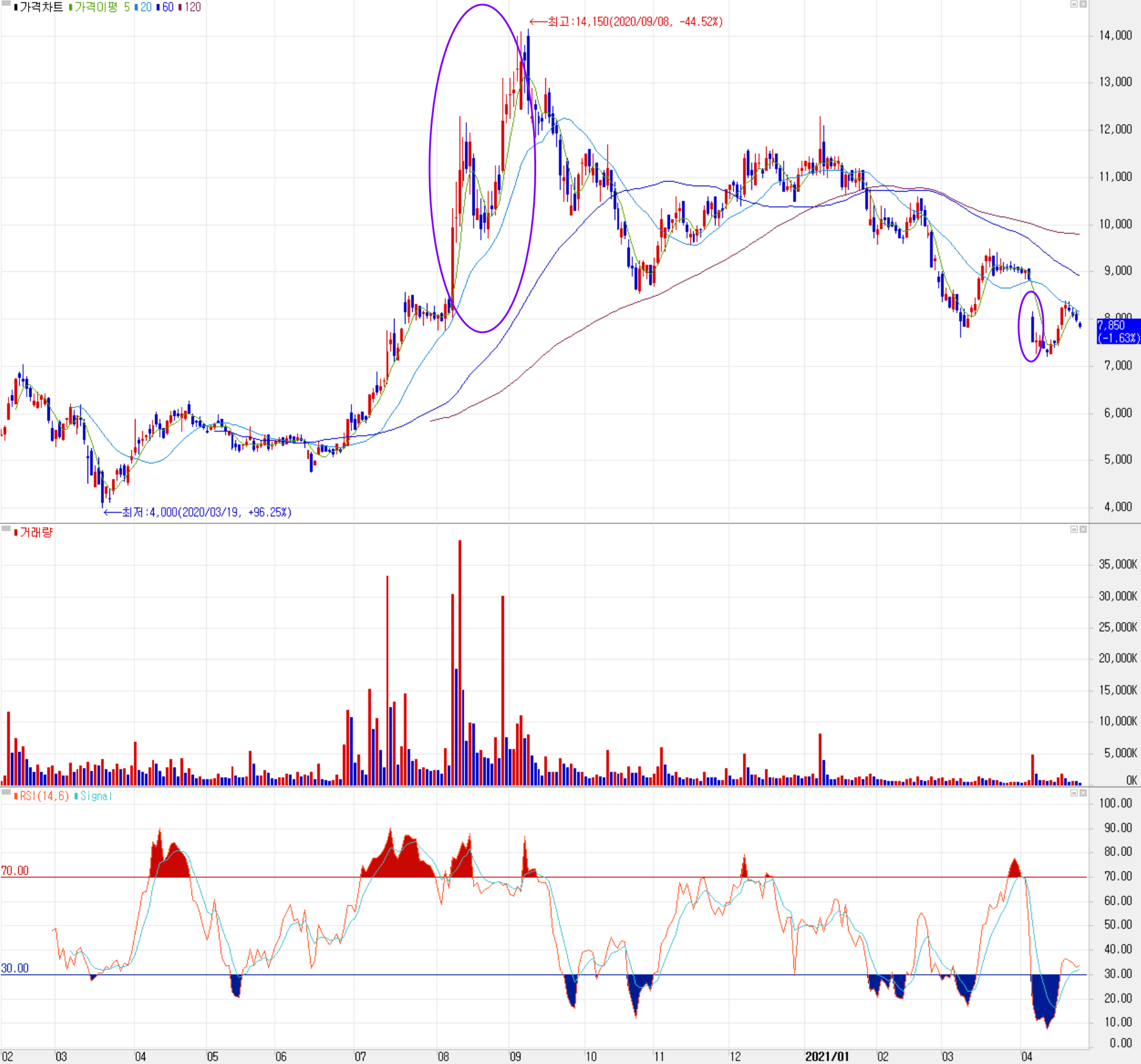 코로나19로 급락한 이후 빠르게 회복한 주가는 7월 들어서면서 디지털 뉴딜, 통신사 5G 투자 재개, 제4이동통신 등의 테마로 급등하면서 9월 8일 최고점인 14,150원을 기록한 후 수급 변동에 따른 급락과 반등을 반복하다가 올해 들어서면서 약세를 지속하고 있습니다. 최근 수급에서는 연기금 등 기관과 외국인이 매수 ㅇ우위를 보이고 있으며, 개인은 매도 우위입니다. 4월 7일 발표한 유상증자 소식에 급락 후 4월 21일 유상증자 결정 공시가 나오면서 지난주 주가는 4 거래일 연속 하락하면서 약세를 보였습니다. 차트 소견 상 개인적인 단기 목표주가는 10,000원으로 설정하였고, 상승 시 8,500원 부근에서 저항이 예상됩니다. 지난해 9월 최고가를 기록한 후 계속 고점이 낮아지는 모습으로, 추가 하락 시 7,200원 선을 지지하는지 확인할 필요가 있어 보입니다. 지난 2020년에는 4G(LTE) 투자가 감소하면서 5G 투자가 활성화될 시기였으나, 코로나19라는 복병을 만나서 어려움을 겪는 와중에 정부 정책을 기반으로 한 테마 등으로 주가의 움직임이 많았으나, 5G 투자 회복기를 지나면서 1분기 실적부터는 확인하고 주가를 점검하는 자세가 필요할 것 같습니다.