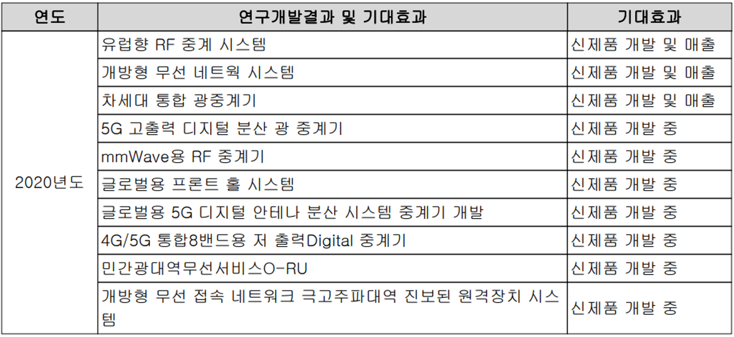 당사는 지난 2020년 유럽 고객사용 무선 중계기 시스템의 개발을 비롯한 5G 용 중계기 등의 연구 개발을 진행 중에 있습니다. 특히 지난해 영국 통신사 EE로부터 당사의 무선통신 중계기인 DAS(Distributed Antenna System)의 공급자로 선정되면서 이에 대한 고객사 제품 개발을 완료 후 납품 중인 것으로 알려지면서 향후 점진적인 매출 확대가 기대됩니다.