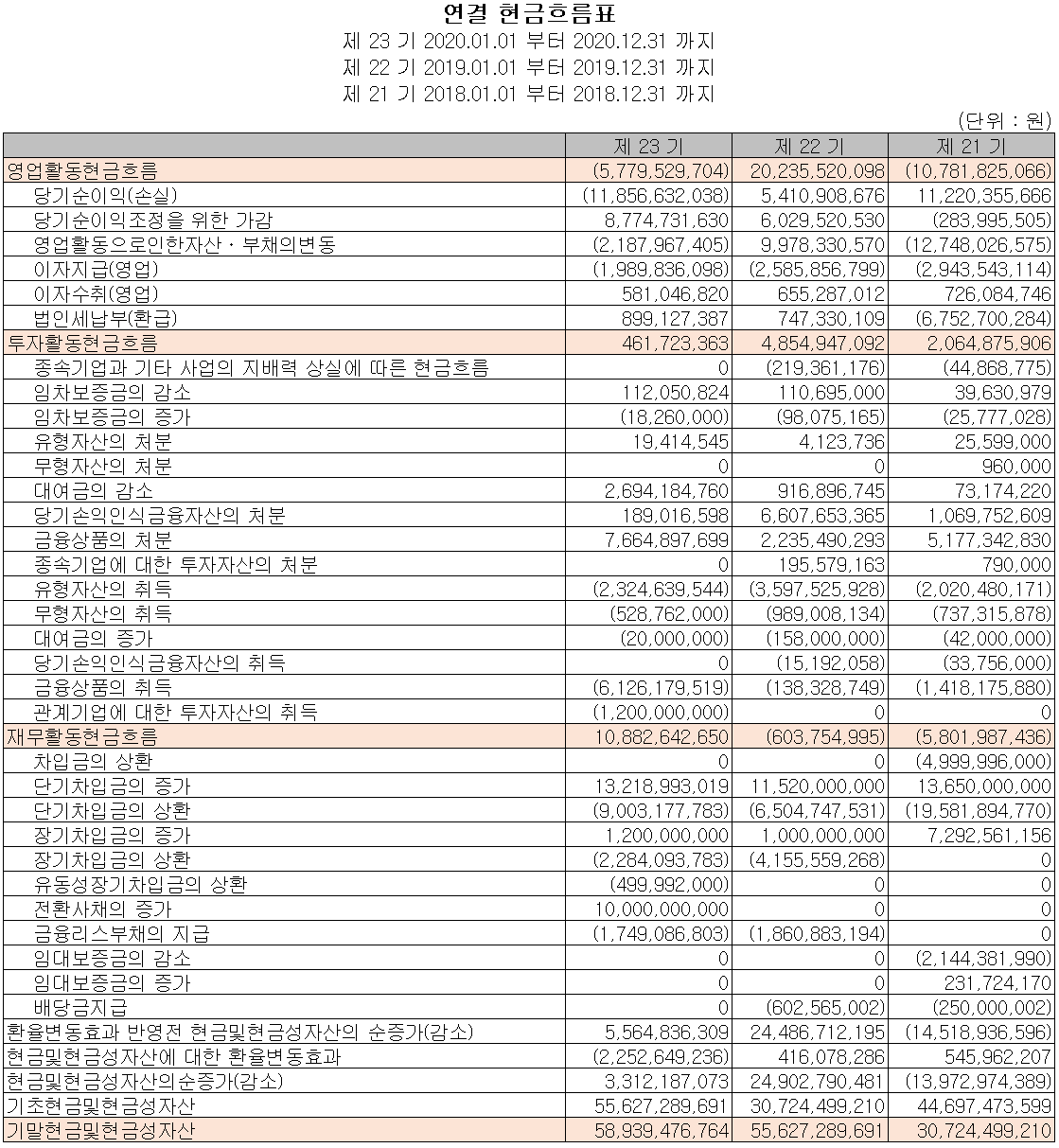 영업활동 현금흐름은 당기순손실, 매입 채무의 증가 등으로 58억 원의 현금이 유출되었고, 차입금과 사채를 통하여 자금을 조달하였으며, 신제품 개발에 따른 유형자산 및 무형자산의 투자 활동을 하였습니다. 2020년 당기 말 기준 당사의 현금 및 현금성 자산은 589억 원입니다.