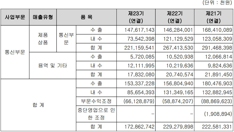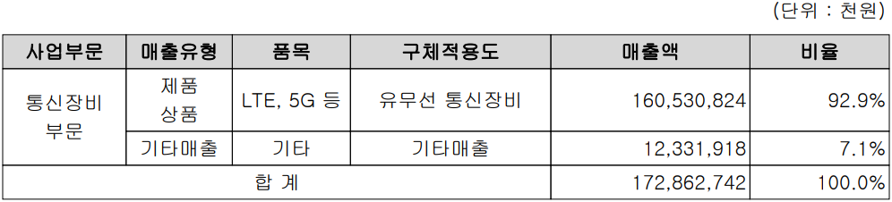 당사는 통신장비의 제조 및 공급을 하는 단일 사업부문으로 구성되어 있으며, LTE, 5G 등 이동통신 서비스를 위한 유무선 통신장비 제품과 용역 및 기타 임대 수익 등이 있습니다. 지난해 당사의 유무선 통신 장비의 매출은 전체 매출의 92.9%를 기록하였습니다.