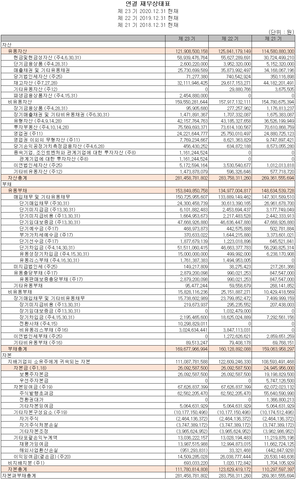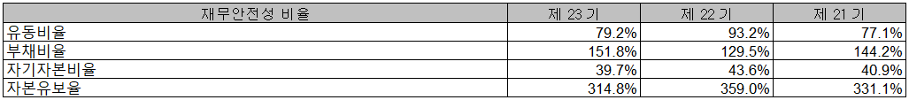 2020년 당사의 재무 안정성 비율에서는 유동비율 79.2%, 부채비율 151.8%, 자기자본비율 39.7%, 자본유보율 314.8%를 기록하였습니다. 5G 투자와 실적 부진에 따른 부채의 증가로 재무상태가 안정적이지 않습니다. 유상증자 등 자금 조달을 위한 노력을 하고 있으나, 근본적으로 전방시장 투자 재개에 따른 1분기 실적과 올해 실적에 대한 가시적인 전망이 중요한 시기인 것 같습니다.