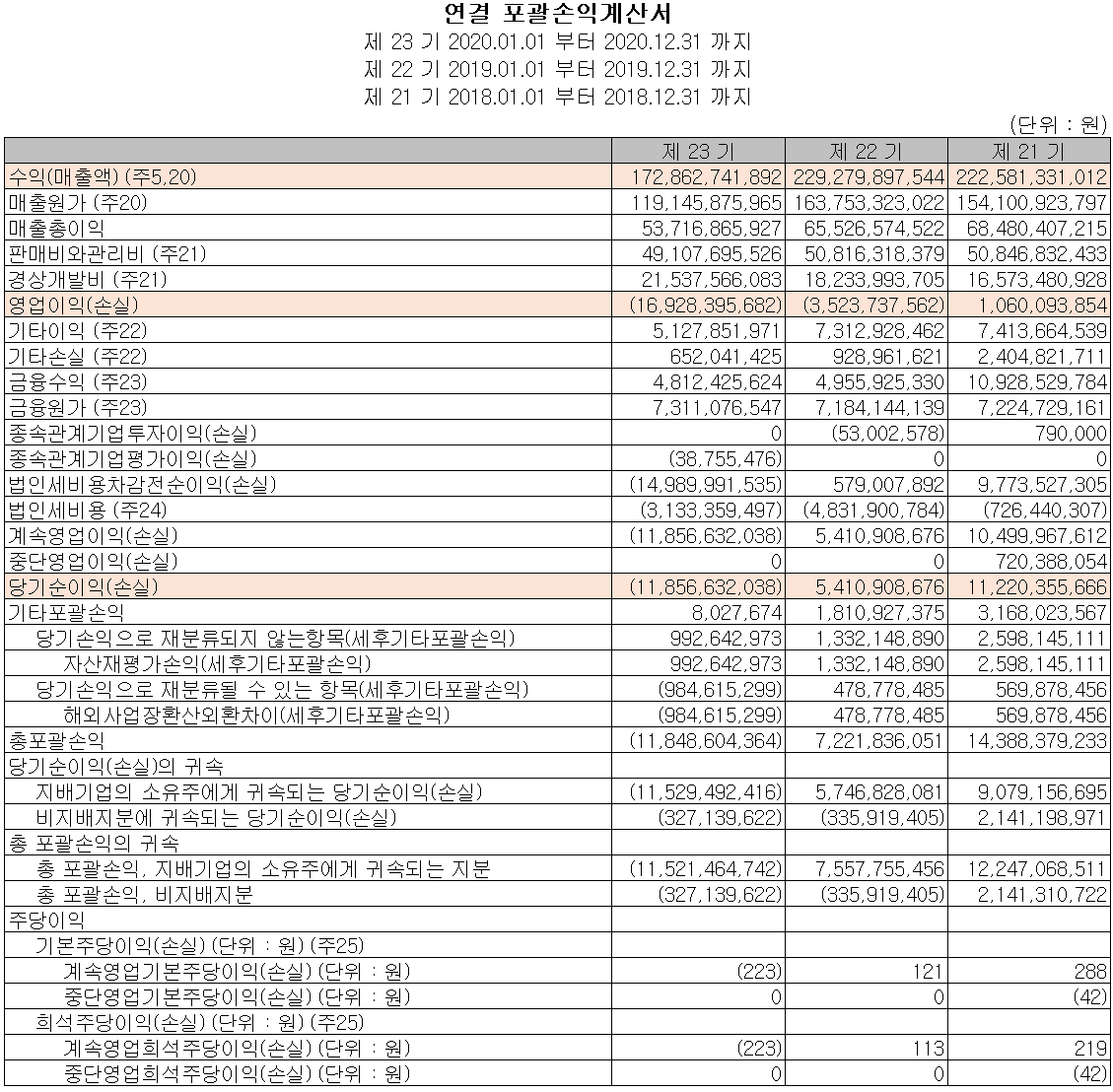 당사의 2020년 실적은 매출액 1,729억 원으로 전년 대비 24.6% 감소했고, 영업손실 169억 원, 당기순손실 119억 원을 기록하면서 적자 전환했습니다. 코로나19의 영향으로 전방산업의 투자가 지연 또는 감소에 따라 매출이 감소했고, 그에 따른 고정비 부담과 5G 국내외 상용화 장비의 개발에 따른 비용 증가 등으로 적자를 기록했습니다.