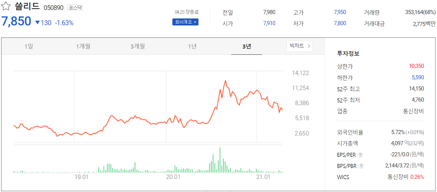 4월 23일 장종료 기준 당사의 주가는 전일보다 1.63% 내린 7,850원에 마감됐습니다. 외국인 비중은 5.72%이며, 시가 총액 4,097억 원으로 코스닥 시총 상위 232위 종목입니다.