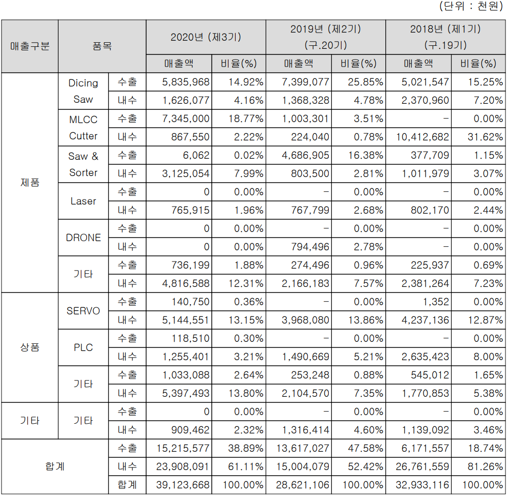 지난해 당사의 주력 제품인 MLCC Cutter의 매출은 전체 매출의 20.99%, Dicing Saw 19.08%, Saw & Sorter 8.01%, Laser 1.96% 등을 기록하였으며, 자동화 부품 사업부문의 SERVO 13.51%, PLC 3.51%의 매출 비중을 나타냈습니다. 전체적으로 수출 38.9%, 내수 61.2%의 매출 비율을 보이고 있습니다.