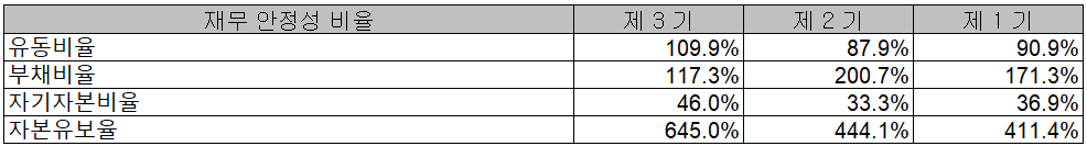 당사의 재무 안정성 비율에서는 유동비율 109.9%, 부채비율 117.3%, 자기자본비율 46%, 자본유보율 645%를 기록하였습니다. 비교적 부채비율이 높지만 전기 대비 자산 증가로 인한 부채비율의 감소폭이 컸으며, 전반적으로 양호한 흐름을 이어가고 있습니다.