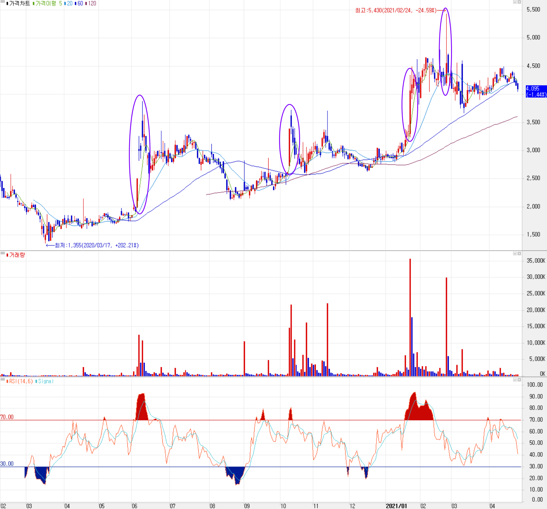 당사의 주가는 지난해 6월 정부의 드론 택시 상업화 로드맵 발표, 10월 드론 택배 시연 행사 그리고 지난 2월에 국내 최초로 드론 택배 사업자등록증이 발행되면서 다지점 배송을 위한 드론 적재함 기술을 보유하고 있는 당사의 주가의 움직임이 컸었고, 지난 1월에는 삼성전기를 비롯한 MLCC(적층 세라믹 콘덴서) 관련주 테마에 반응하면서 크게 올랐습니다. 지난 2월 24일 최고가인 5,430원을 기록한 후 일부 조정을 받다가 최근 4,000~ 4,500원 사이에서 움직이는 모습입니다. 최근 한 달간 수급에서는 기관의 수급은 거의 없는 편이고, 외국인과 개인의 공방 속에 개인의 매수 우위를 보이는 상황입니다. 차트 소견으로 개인적인 목표주가는 단기적으로 4,800원으로 설정하였고, 상승 시 4,350원 부근에서 저항이 예상됩니다.