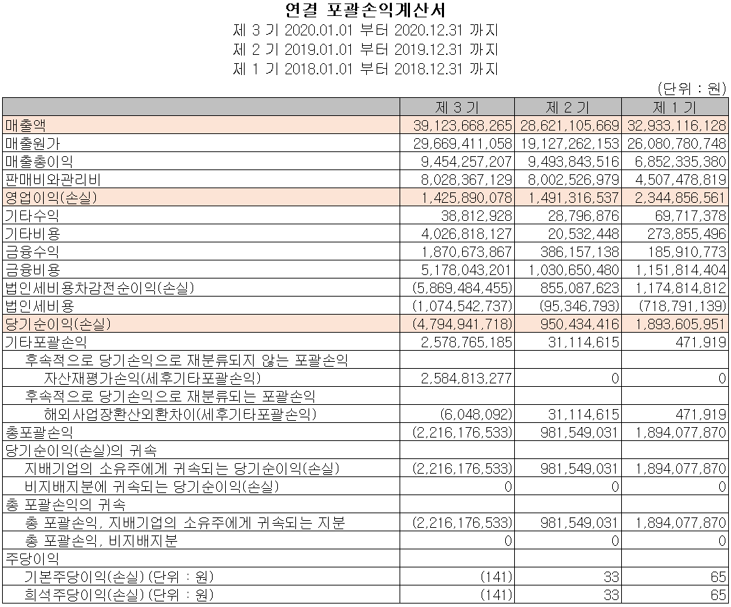 당사의 2020년 실적은 매출액 391억 원으로 전년 대비 36.7% 증가했고, 영업이익은 14억 원으로 4.4% 감소, 당기순손실 48억 원을 기록하면서 적자 전환했습니다. 전반적으로 코로나19의 영향으로 수출은 부진했으나 내수 수요의 증가에 따른 매출이 증가했고, 산업용 로봇 자동화 부품을 유통하는 (주)케이와이에스를 통한 매출이 인식되었습니다. 당기순손실의 주된 요인은 스팩합병에 따른 상장비용, 파생상품 평가손실 등입니다.