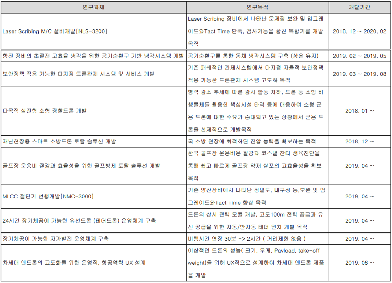 당사의 연구 개발 분야는 크게 반도체 및 디스플레이 등의 제조 공정용 장비 개발과 드론 개발로 구성되어 있습니다. 지난해 전체 매출액의 10.25%에 해당되는 35억 원 규모의 비용을 연구개발에 투입했습니다.