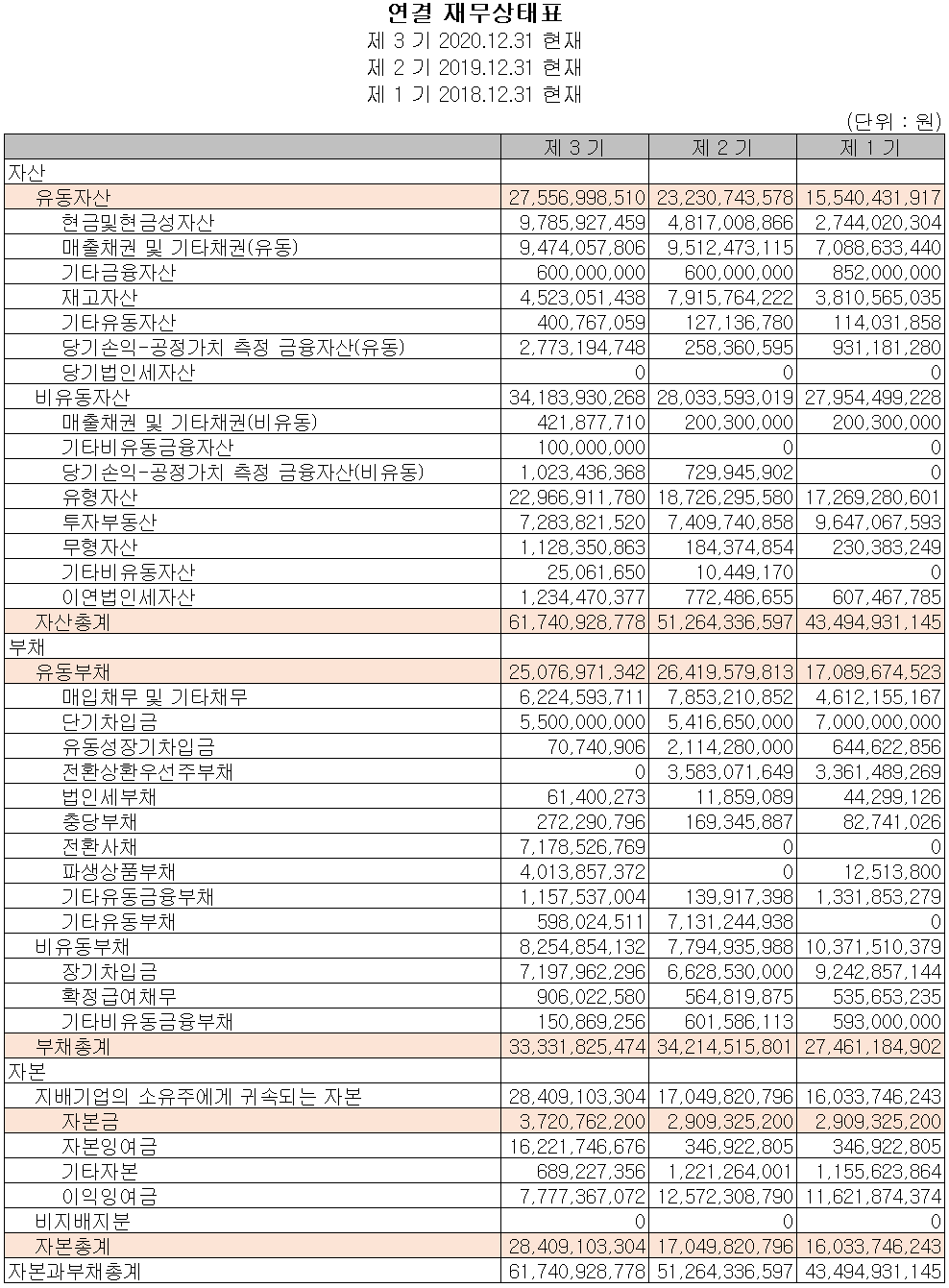 2020년 당기 말 당사의 자산은 전기 대비 105억 원 증가한 617억 원으로 현금 및 현금성 자산의 증가, 유형자산의 증가가 있었습니다. 부채는 전년 대비 9억 원 감소한 333억 원을 기록했습니다.