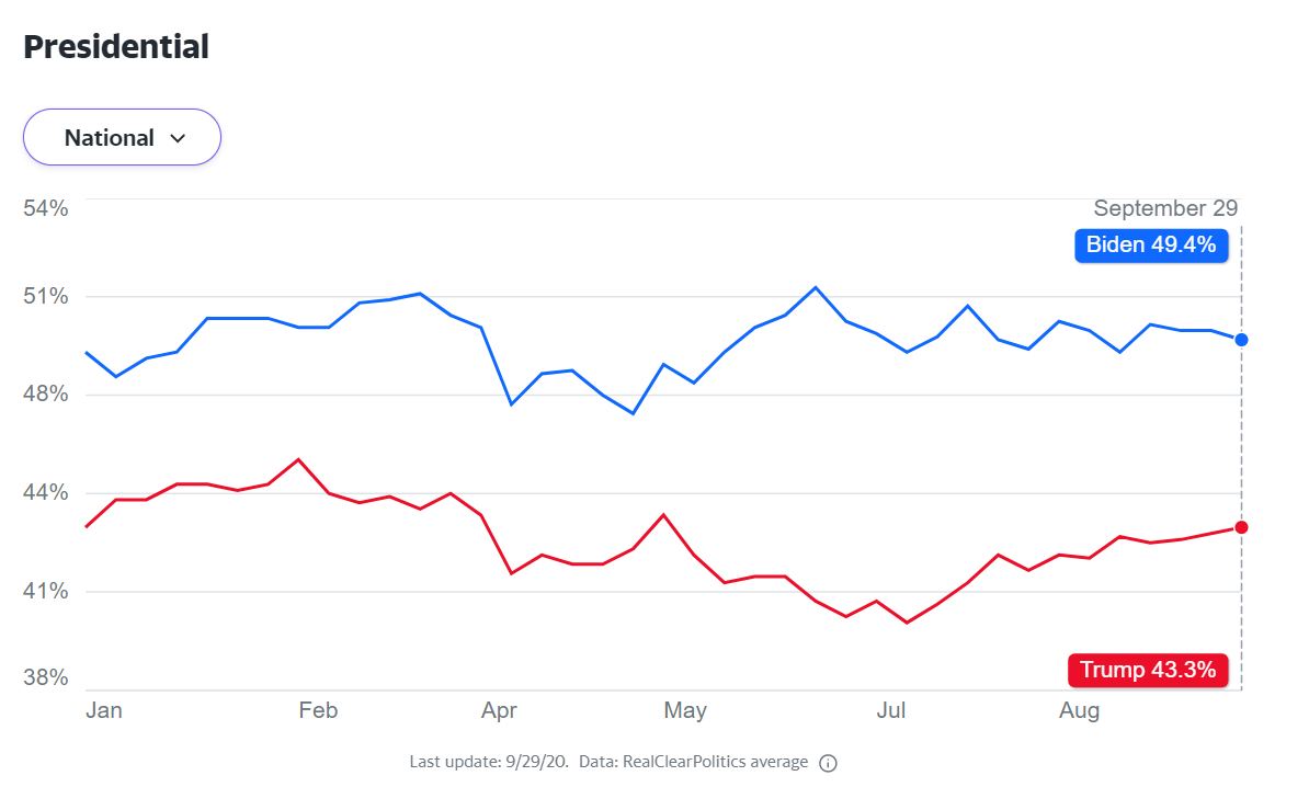 어제 까지는 바이든 후보가 트럼프 후보를 6.1%포인트 앞서고 있네요, 6월 초부터 벌어지던 지지율 격차가 8월부터 좁혀지는 모습니다. 앞으로 선거까지 한 달여 밖에 남지 않았기 때문에 당분간은 지지율도 유심히 봐야 할 것 같습니다.