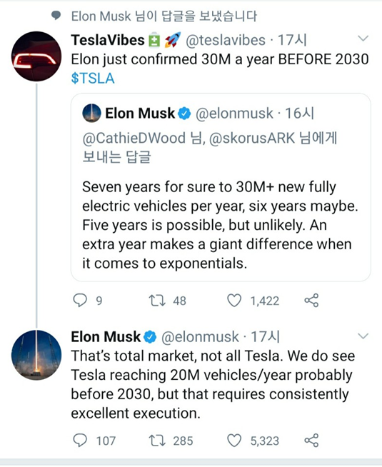 테슬라 CEO 일론 머스크는 그의 트위터를 통해서 2030년 이전에 연간 전기차 생산량 2000만대를 달성할 것이라고 했습니다. 글로벌하게 전기차 생산량은 3000만 대에 달한다고 하니 전 세계 전기차 생산량의 3분의 2를 테슬라에서 만들겠다는 계획입니다.