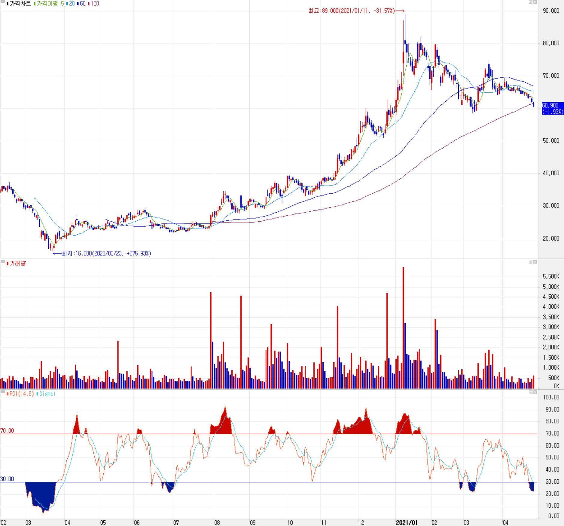 4월 26일 장종료 기준 당사의 주가는 1.93% 내린 60,900원에 거래를 마쳤습니다. 외국인 비중은 23.54%이며, 시가 총액 2조 8,597억 원으로 코스피 시총 상위 111위 종목입니다.