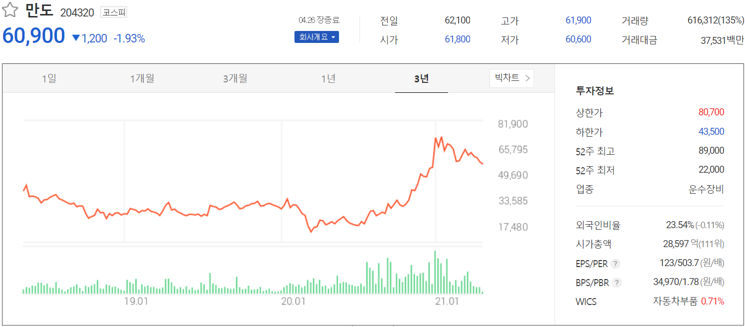 지난해 코로나19로 급락했던 3월 이후 꾸준한 상승세를 보이던 당사의 주가는 후반으로 가면서 자동차 산업의 회복, 현기차-애플카, 자율주행 등의 테마로 급등하기 시작하면서 1월 11일 최고가인 89,000원을 기록한 후 시장 수급변동과 차량용 반도체 공급 부족에 따른 악영향으로 인해 실적 축소가 불가피한 상황이 시작되면서 최근 하락세를 보이고 있습니다. 수급에서는 개인의 매수우위가 강한 가운데, 기관의 모습은 소극적으로 보이는 상황입니다. 차량용 반도체의 수급회복 및 자율주행과 최근 이슈화되고 있는 한온시스템의 인수에 대한 영향이 당사의 중장기 주가의 방향을 보여줄 것으로 생각됩니다. 예상 실적 및 차트 소견을 종합한 개인적인 목표주가는 87,000원으로 설정하였고, 추가 하락 시에는 59,000원을 지지하는지 지켜보고, 상승 시에는 67,000원, 73,000원 부근에서 저항이 예상됩니다.
