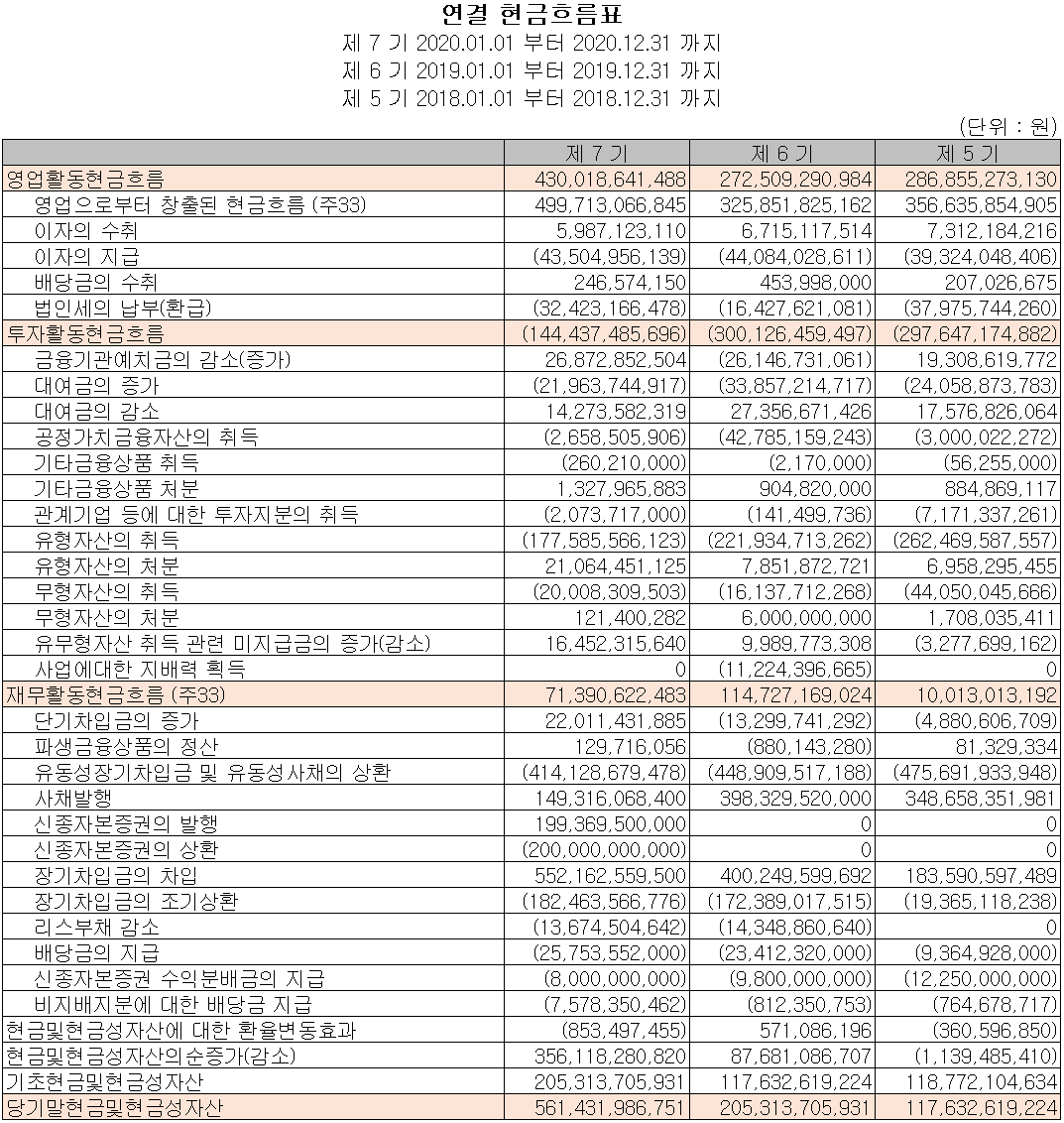 2020년 당사의 현금흐름은 영업활동으로 꾸준히 현금을 창출하는 등 총 4,300억 원의 현금이 유입되었고, 차입금 조달을 통해 부채의 상환 및 배당금을 지급하였습니다. 2020년 당기 말 기준 현금 및 현금성 자산의 규모는 전기보다 3,561억 원이 증가한 5,614억 원입니다.