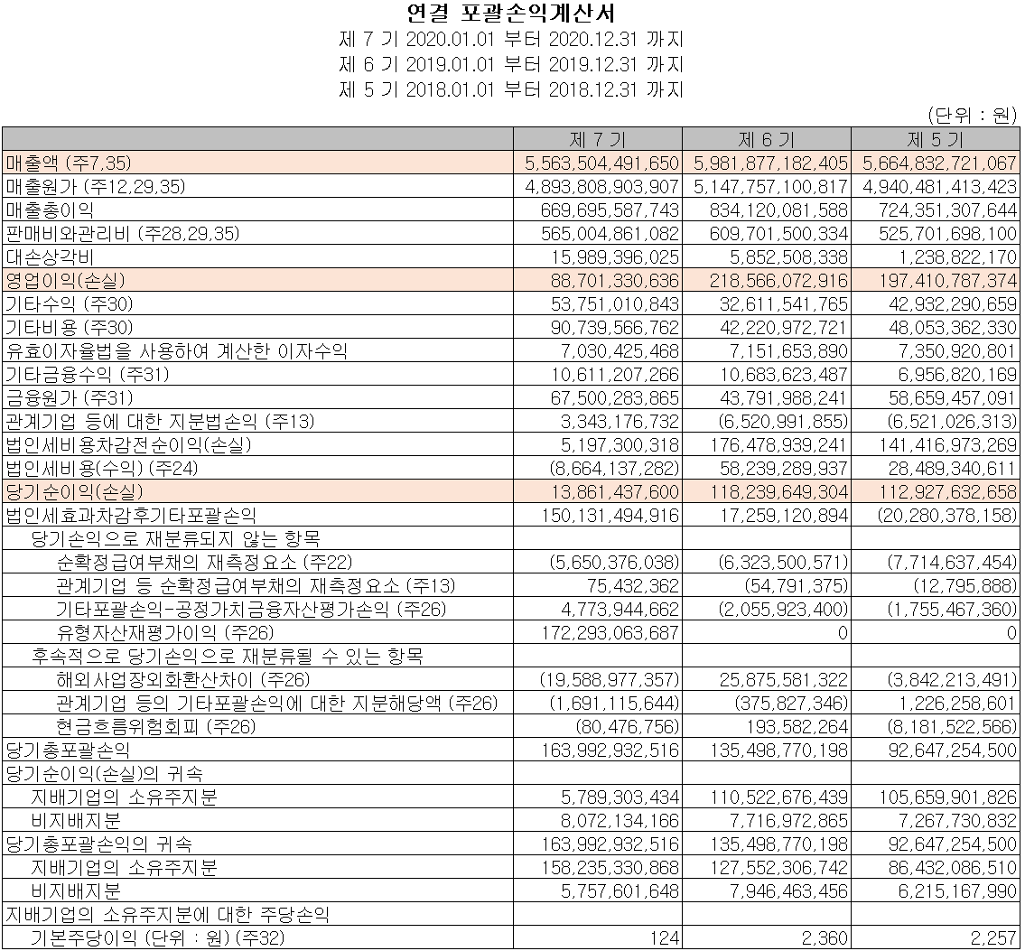 당사의 2020년 실적은 매출액 5조 5,635억 원으로 전년 대비 7% 감소했으며, 영업이익은 887억 원으로 59.4% 감소, 당기순이익은 139억 원을 기록하면서 88.3% 감소하였습니다. 코로나19로 인해 국내외 전방 산업의 수요 감소에 따른 매출이 감소하였고, 지난해 실시한 희망퇴직 제도를 통해 538억 원의 퇴직 급여가 매출원가에 반영되면서 이익이 감소하였습니다.