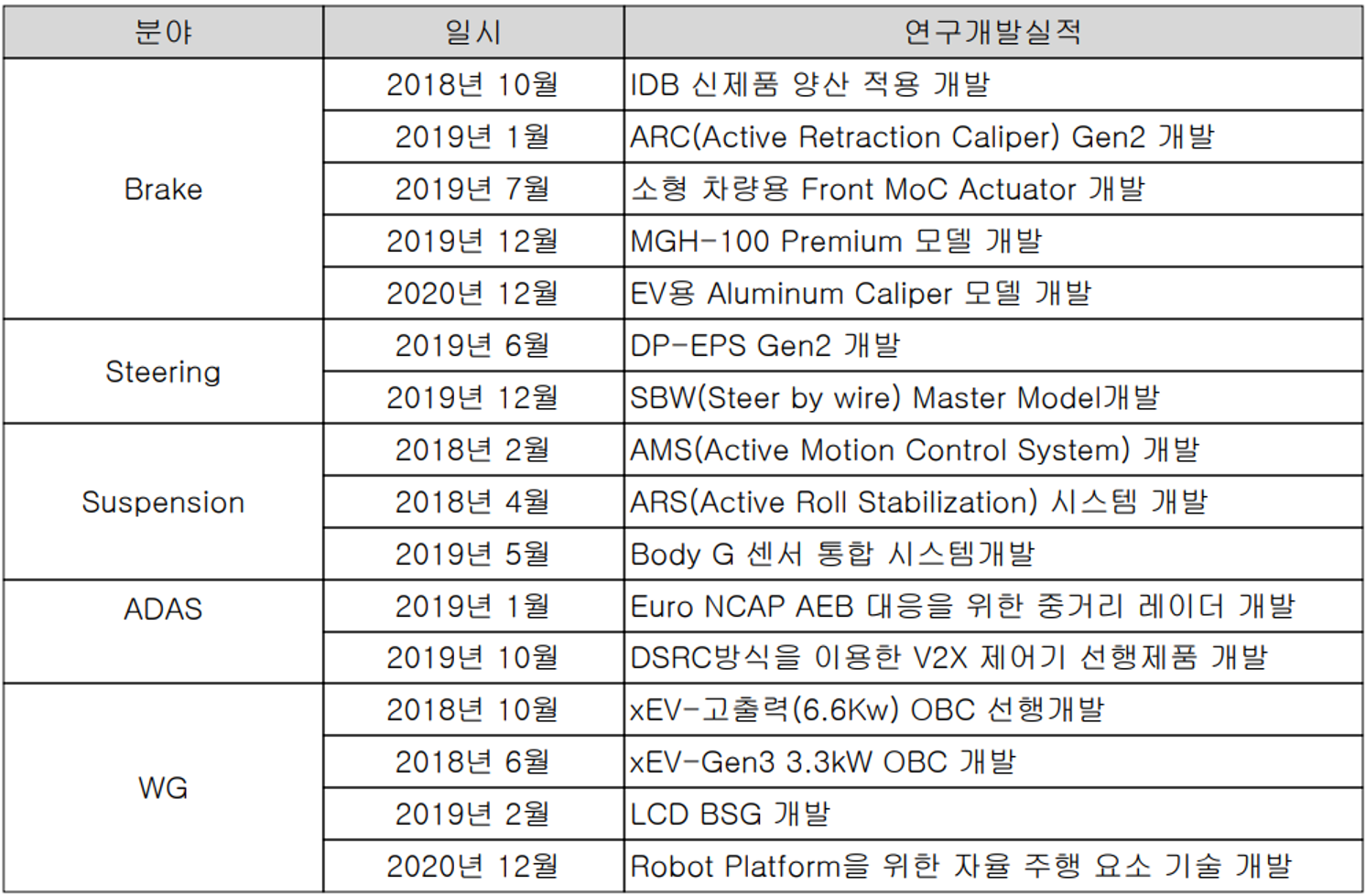 지난 2020년 매출액의 5.8%에 해당하는 3,337억 원 규모의 연구개발비를 투입하였으며, 전기차용 Aluminum Caliper, ADAS 시스템을 위한 V2X 제어기, 중거리 레이더 및 로봇 플랫폼을 위한 자율 주행 요소 기술 개발 등을 수행하였습니다.