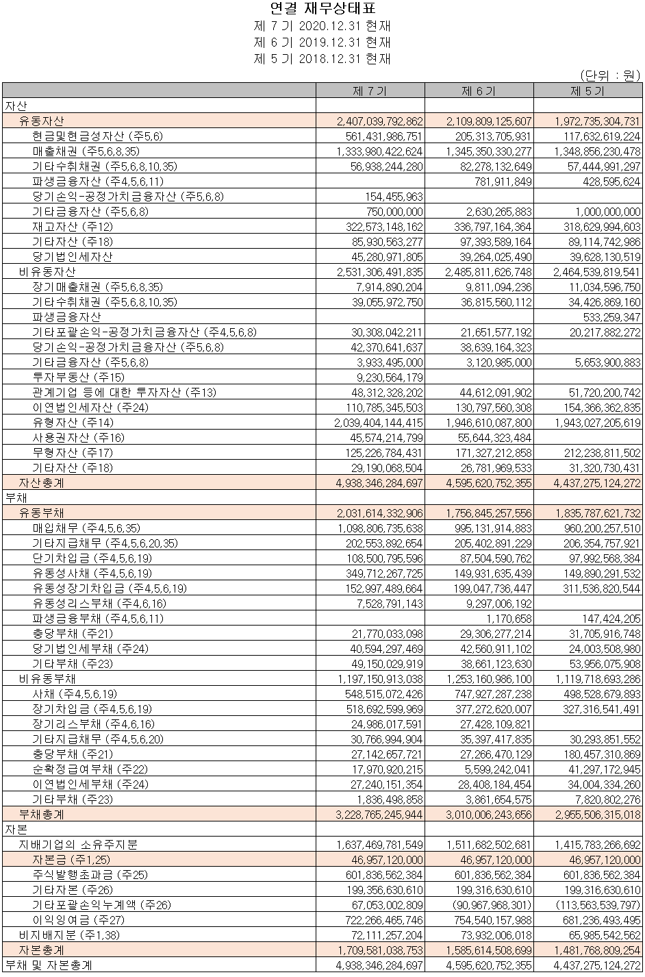 2020년 당기 말 자산총계는 전년 대비 3,427억 원이 증가한 4조 9,383억 원으로, 코로나19 영향 등으로 인한 경기 변동에 대응하기 위해 유동성 확보 측면의 일환으로 현금 및 현금성 자산의 증가 등이 있었습니다. 부채는 전기 대비 2,188억 원을 증가한 3조 2,288억 원으로 자기 차입금의 증가, 매입 채무의 증가에 따른 것입니다.