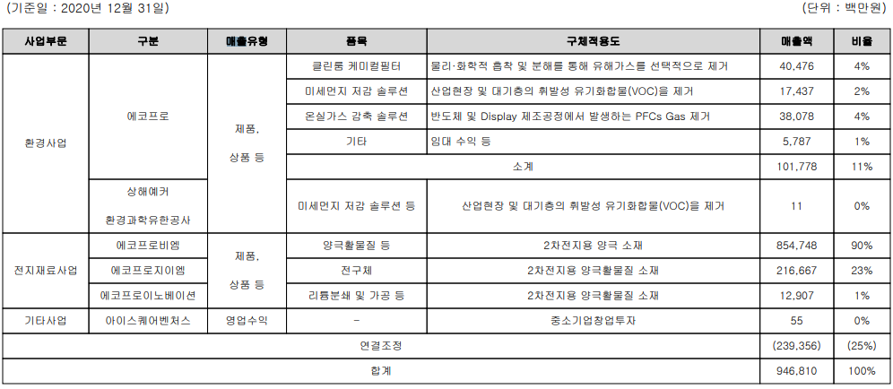 지난 2020년 연결 기준 전체 매출 중 환결 사업을 영위하는 당사의 매출은 전체 매출의 11%, 2차전지 양극재 사업을 주로 하는 에코프로비엠은 90%, 2차전지 전구체를 제조하는 에코프로지이엠은 23%, SK이노베이션과 합자 설립한 에코프로이노베이션은 1% 등의 매출 비중을 나타냈습니다.