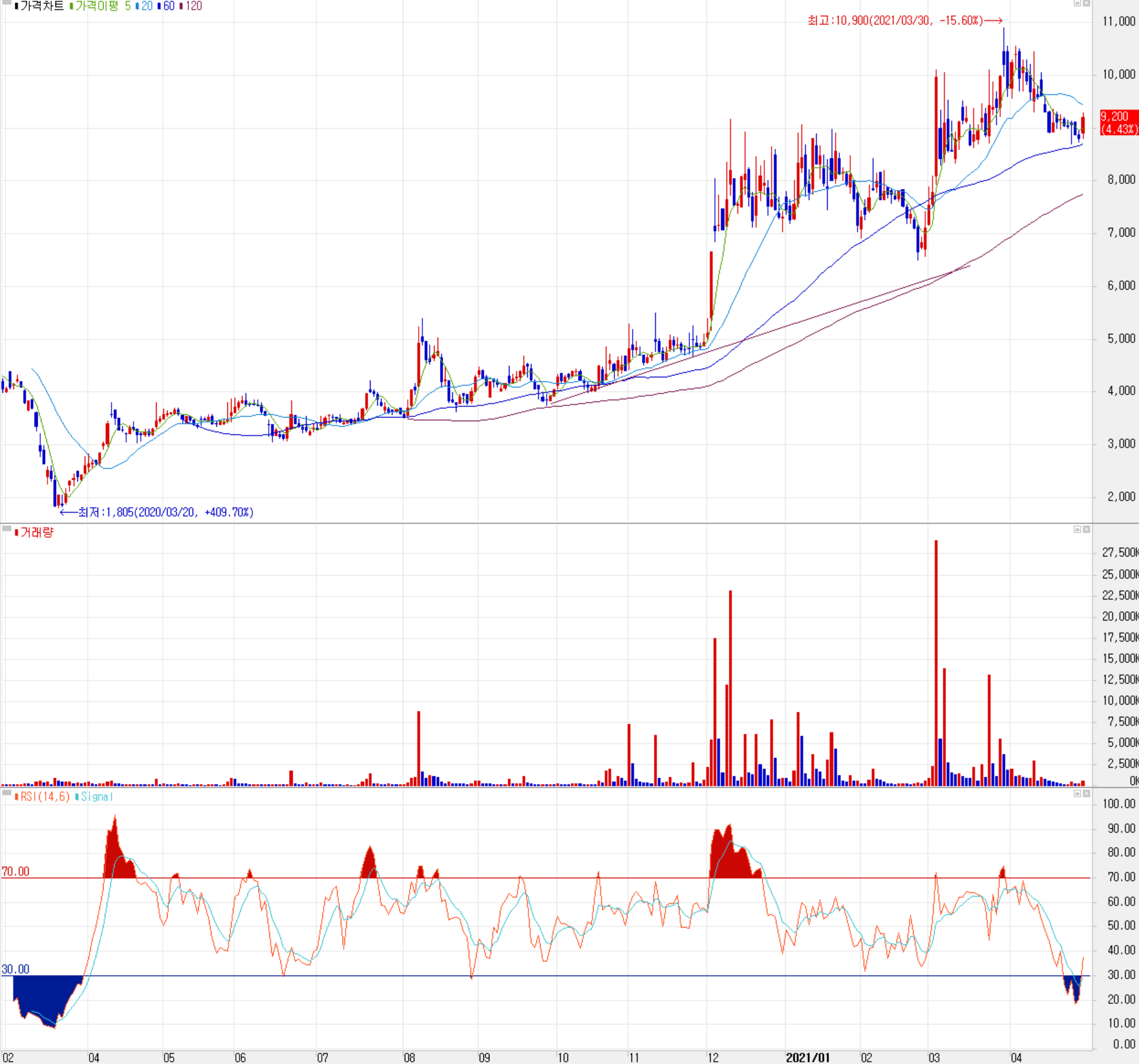 당사의 지난 2020년 3월 코로나19 팬데믹으로 급락한 후 완만한 회복세를 보이면서 상승했습니다. 2020년 상반기의 전방 수요 부진을 딛고 하반기부터 SUV를 중심으로 수요 증가 및 신차 출시에 의한 실적이 개선되면서 상승세를 이어갔습니다. 12월 초부터 최근까지는 크게 두 번의 급등이 있었으나, 대부분 윤석열 관련주 테마로 인한 상승으로 판단되며, 최근 들어서는 차량용 반도체 공급 부족에 따른 차량 생산 차질 여파로 당사 포함 자동차 부품 관련 종목들이 약세가 지속되고 있습니다. 차트 소견 상 개인적인 목표 주가는 10,000원으로 설정하였으며, 당분간은 정치 테마주로서 변동성이 예상되는 중에 1분기 실적에 따른 중기적 접근이 필요할 것 같습니다.