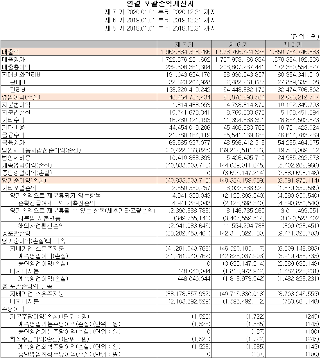 당사의 2020년 실적은 매출액 1조 9,624억 원으로 전년 대비 0.7% 감소했고, 영업이익은 485억 원으로 121.5% 증가, 당기순손실은 408억 원으로 적자 지속입니다. 원가절감 및 경엽 합리화를 통한 영업이익이 증가하였으나, 코로나19로 인한 상반기 가동률 감소와 환율 변동에 따른 외환차 손익으로 당기순손실을 기록했습니다.