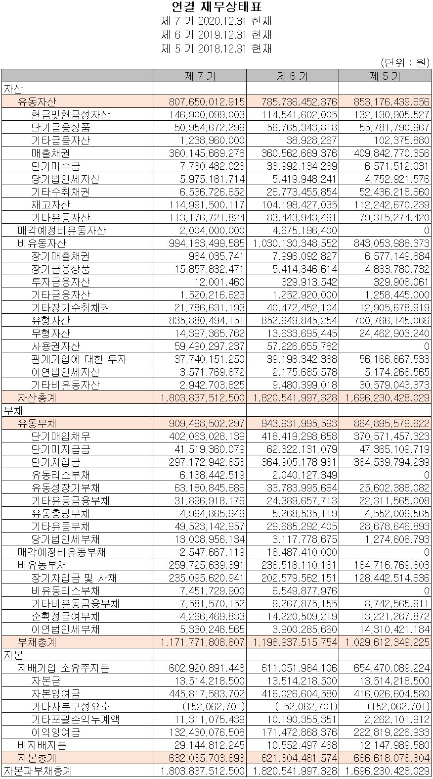 2020년 당기 말 자산총계는 전년 대비 0.9%(167억 원) 감소한 1조 8,038억 원으로 현금성 자산의 증가가 있었으나, 유형자산의 처분으로 전체 자산이 소폭 감소하였습니다. 부채는 전기 대비 2.3% 감소한 1조 1,718억 원으로 매입채무 및 단기 차입금의 감소가 있었습니다.