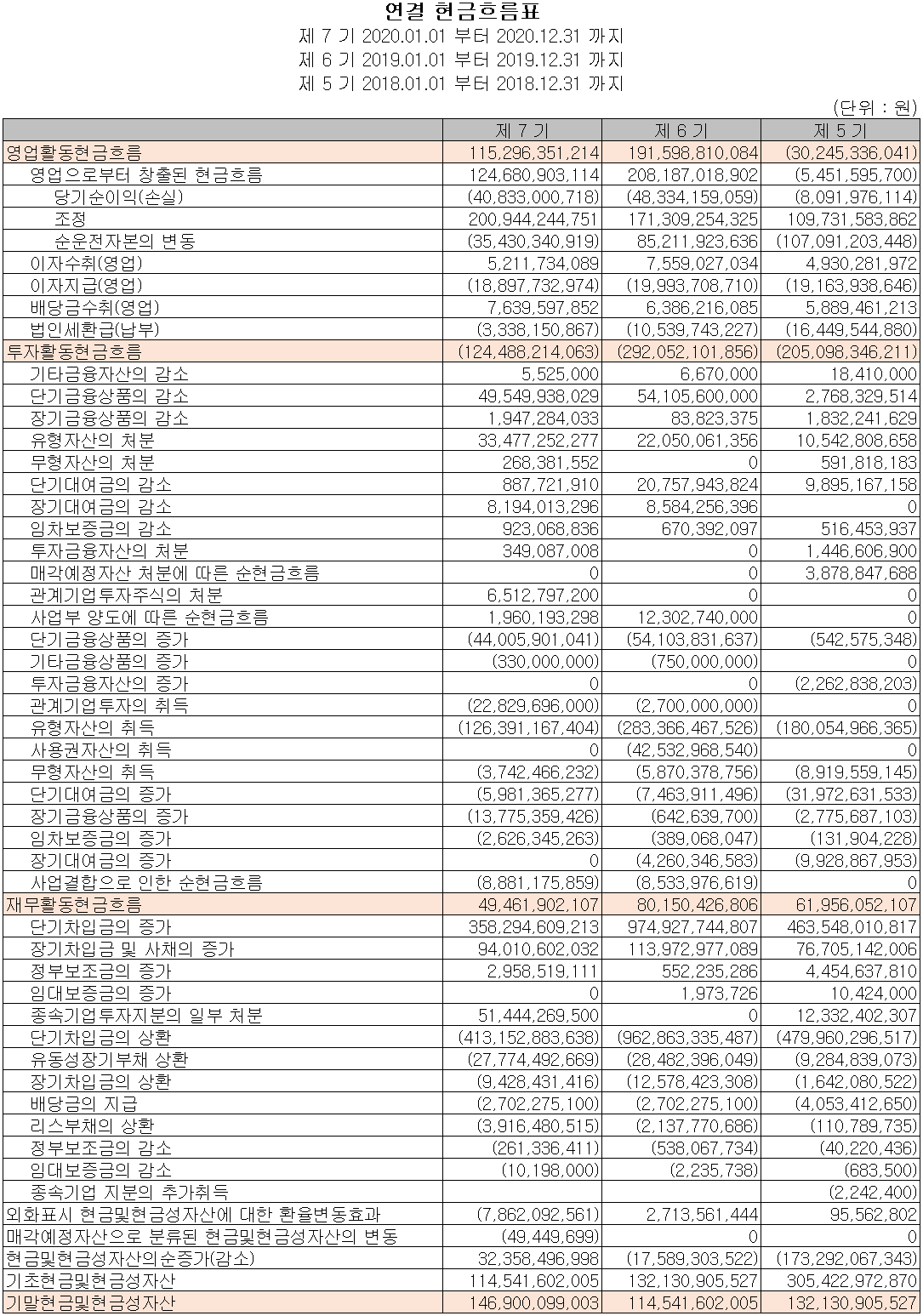 2020년 당기 말 영업활동으로 인한 현금흐름은 전년 대비 763억 원이 감소한 1,153억 원으로 당기순손실에 기인한 것입니다. 장단기 차입금을 통해 자금을 조달하고 있으며, 부채를 상환하고, 배당금을 지급하였습니다.