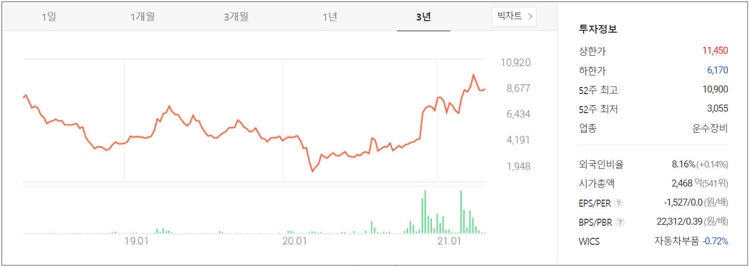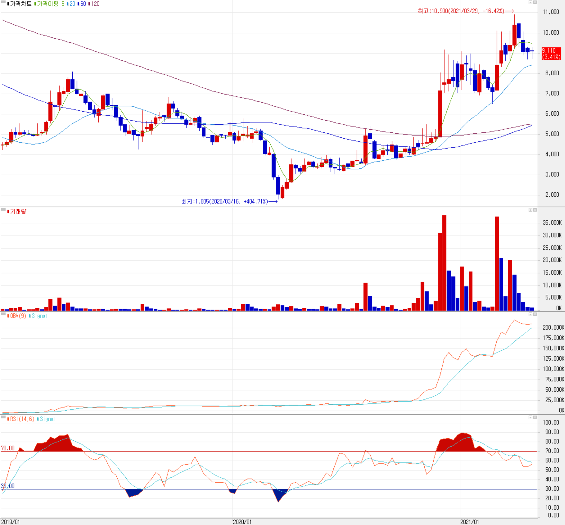 당사의 지난 2020년 3월 코로나19 팬데믹으로 급락한 후 완만한 회복세를 보이면서 상승했습니다. 2020년 상반기의 전방 수요 부진을 딛고 하반기부터 SUV를 중심으로 수요 증가 및 신차 출시에 의한 실적이 개선되면서 상승세를 이어갔습니다. 12월 초부터 최근까지는 크게 두 번의 급등이 있었으나, 대부분 윤석열 관련주 테마로 인한 상승으로 판단되며, 최근 들어서는 차량용 반도체 공급 부족에 따른 차량 생산 차질 여파로 당사 포함 자동차 부품 관련 종목들이 약세가 지속되고 있습니다. 차트 소견 상 개인적인 목표 주가는 10,000원으로 설정하였으며, 당분간은 정치 테마주로서 변동성이 예상되는 중에 1분기 실적에 따른 중기적 접근이 필요할 것 같습니다.