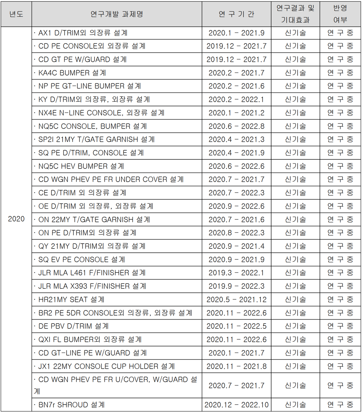당사는 지난해 전체 매출의 3.8%에 해당되는 394억 원 규모의 비용을 연구개발에 투입하면서 사업과 연관된 자동차 내외장 제품의 설계를 위한 28건의 연구 개발을 진행 중에 있습니다.
