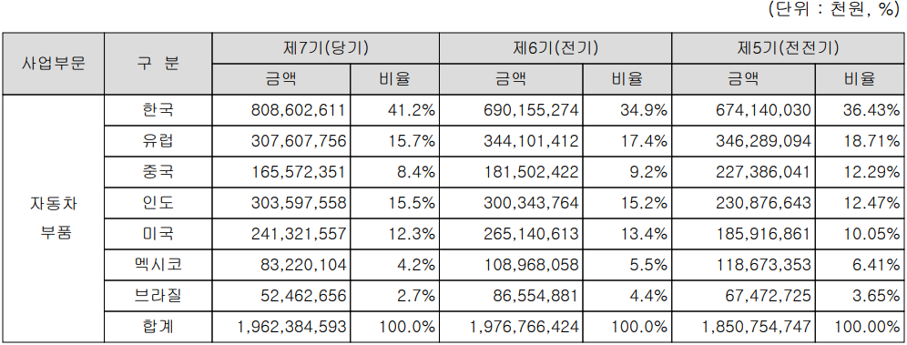 당사와 25개의 국내외 종속회사는 자동차 내외장품 및 상용차의 시트(SEAT)와 전장 부품을 전문으로 생산하는 자동차 부품을 사업으로 주력으로 하는 업체입니다. 지난해 지역별 매출에서는 한국 41.2%, 유럽 15.7%, 인도 15.5%, 미국 12.3%, 중국 8.4%, 멕시코 4.2%, 브라질 2.7% 등의 매출 비중을 보였습니다. 인도는 2019년 양산을 개시한 아난타푸르 공장이 포함되어 기저효과로 인한 증가세를 보였으나, 기타 국내를 제외한 모든 지역에서 매출이 감소하였습니다. 다만 국내의 경우 자동차 소비 진작을 위한 개별소비세 할인, 세제혜택과 캠핑인구 증가로 대변되는 SUV 선호현상 등으로 전년 대비 17% 증가하였습니다.